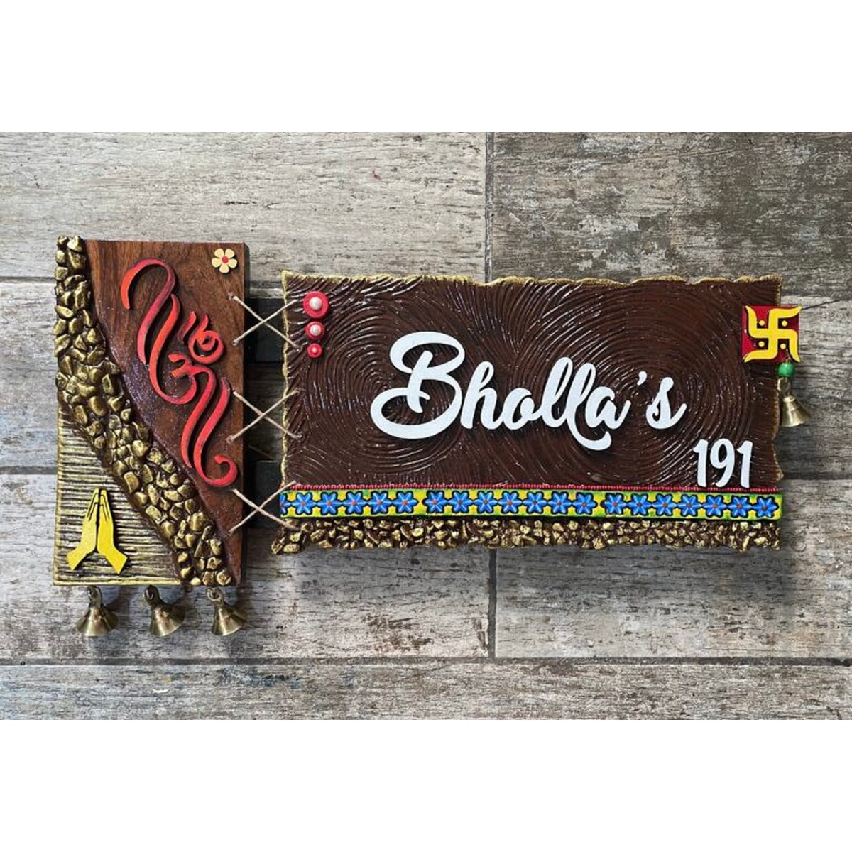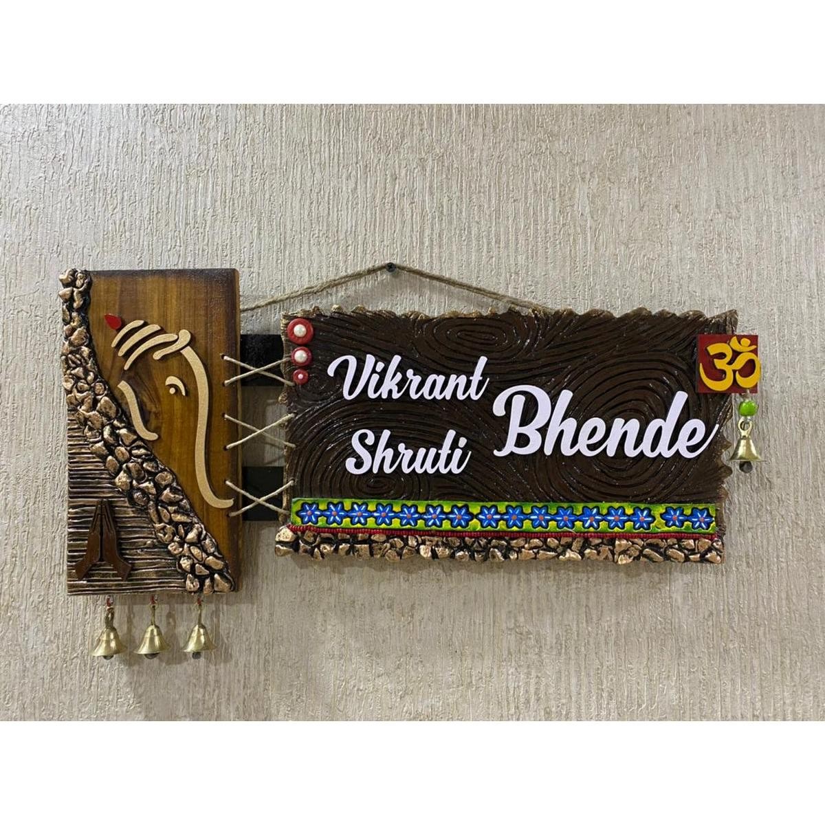 Abstract Ganesh Wavy Edges Wooden Nameplate. Customized Abstract Ganesh Wavy Edges Wooden Nameplate has all elements of an ethnic look. We have placed surname bigger than names, so it will hi-light perfectly. We gave many colorful patches so the brown base comes into nice contrast. Stones on both plates are giving a beautiful uneven rusty feel. Brass Bells are completing the look.