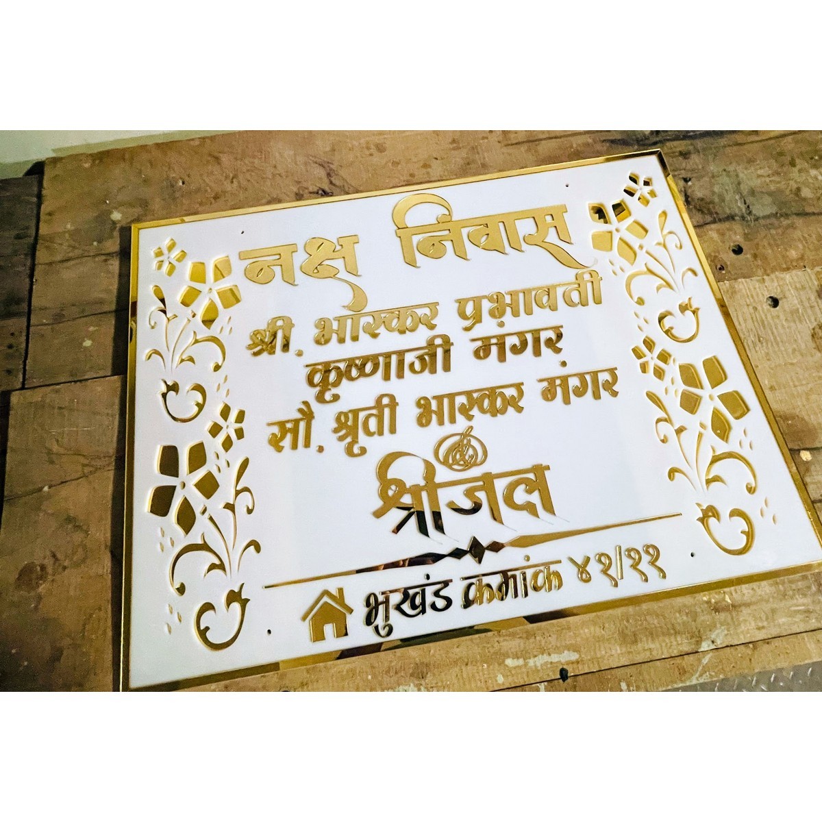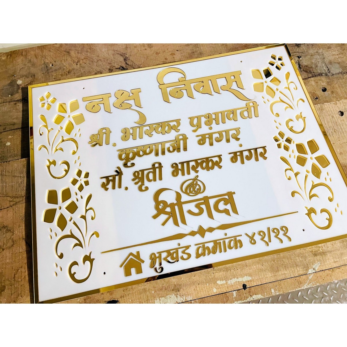 Acrylic Home Customizable Name Plate Embossed Letters. Get your Embossed Letters Name Plate today only at Hitchki. This is a House Name Plate made up of Acrylic material. A white acrylic sheet is used in the base in support of the Golden acrylic sheet. The shine of the name is permanent, customers can see in their face in the nameplate reflection. The plate will be customized as per the requirements of the customer.