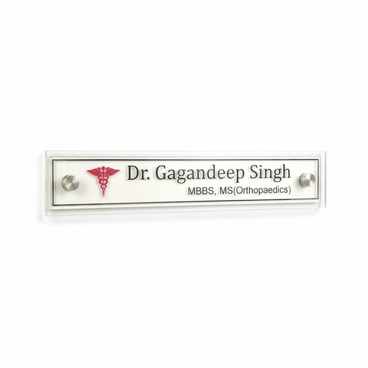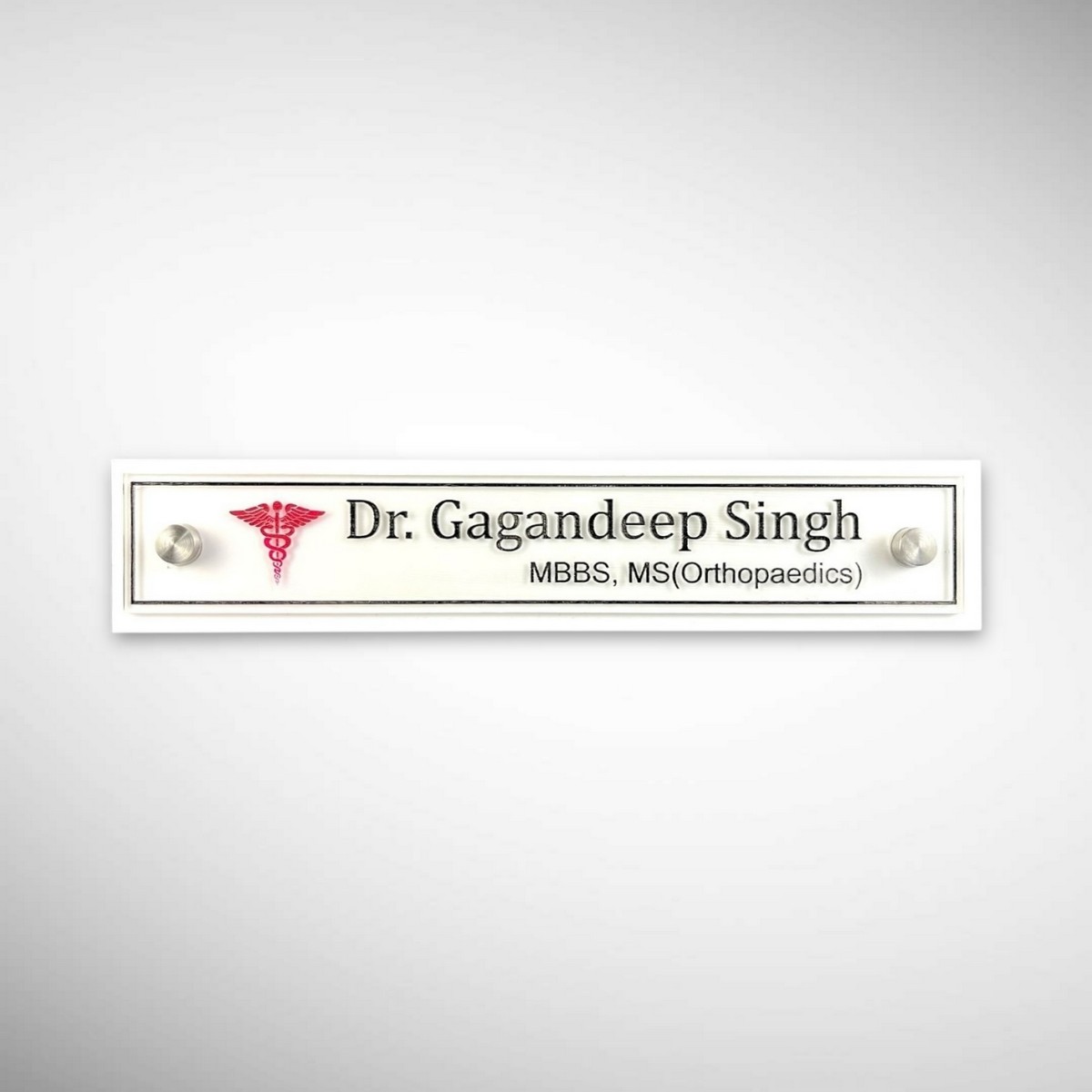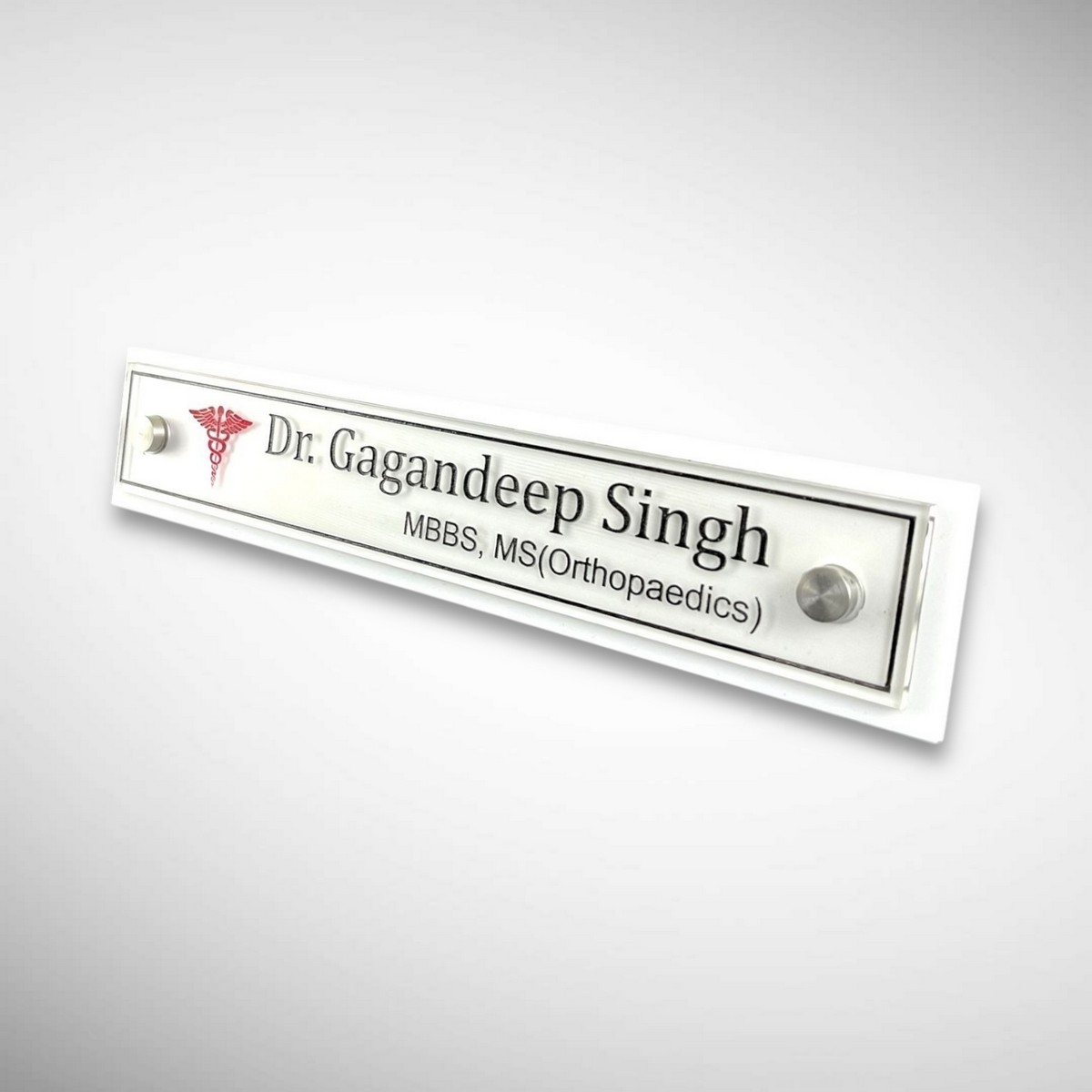 Designed with a minimalist white base and crystal-clear acrylic lettering, this nameplate reflects trust, credibility, and modern sophistication. Whether placed in a clinic, hospital cabin, or private chamber, it enhances your professional identity instantly.