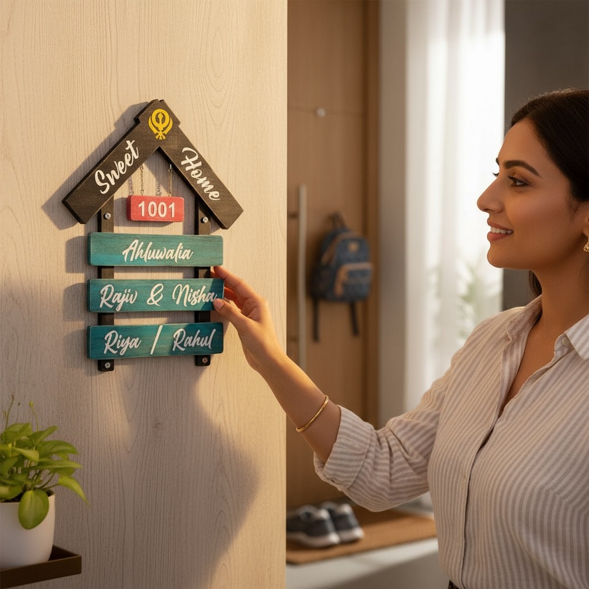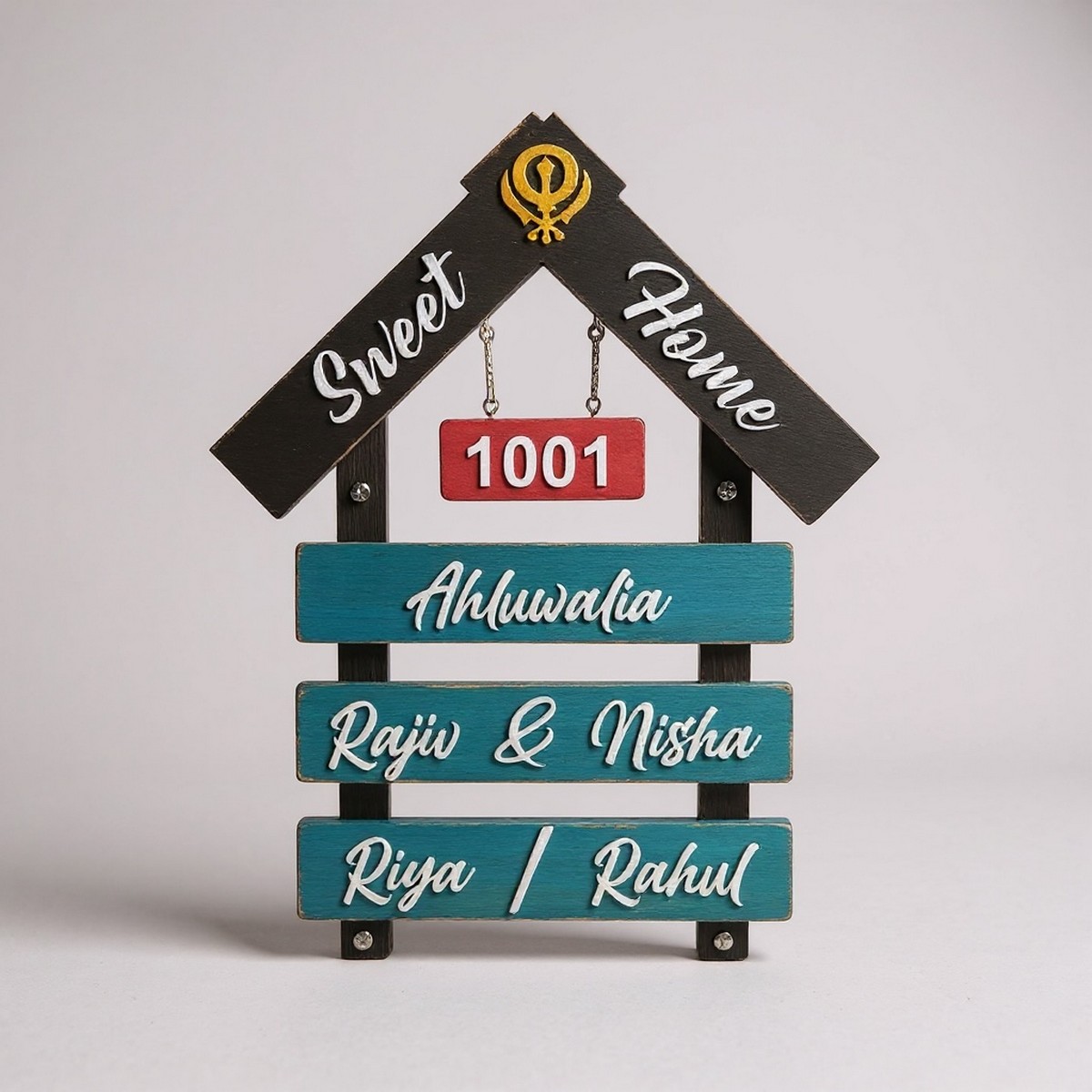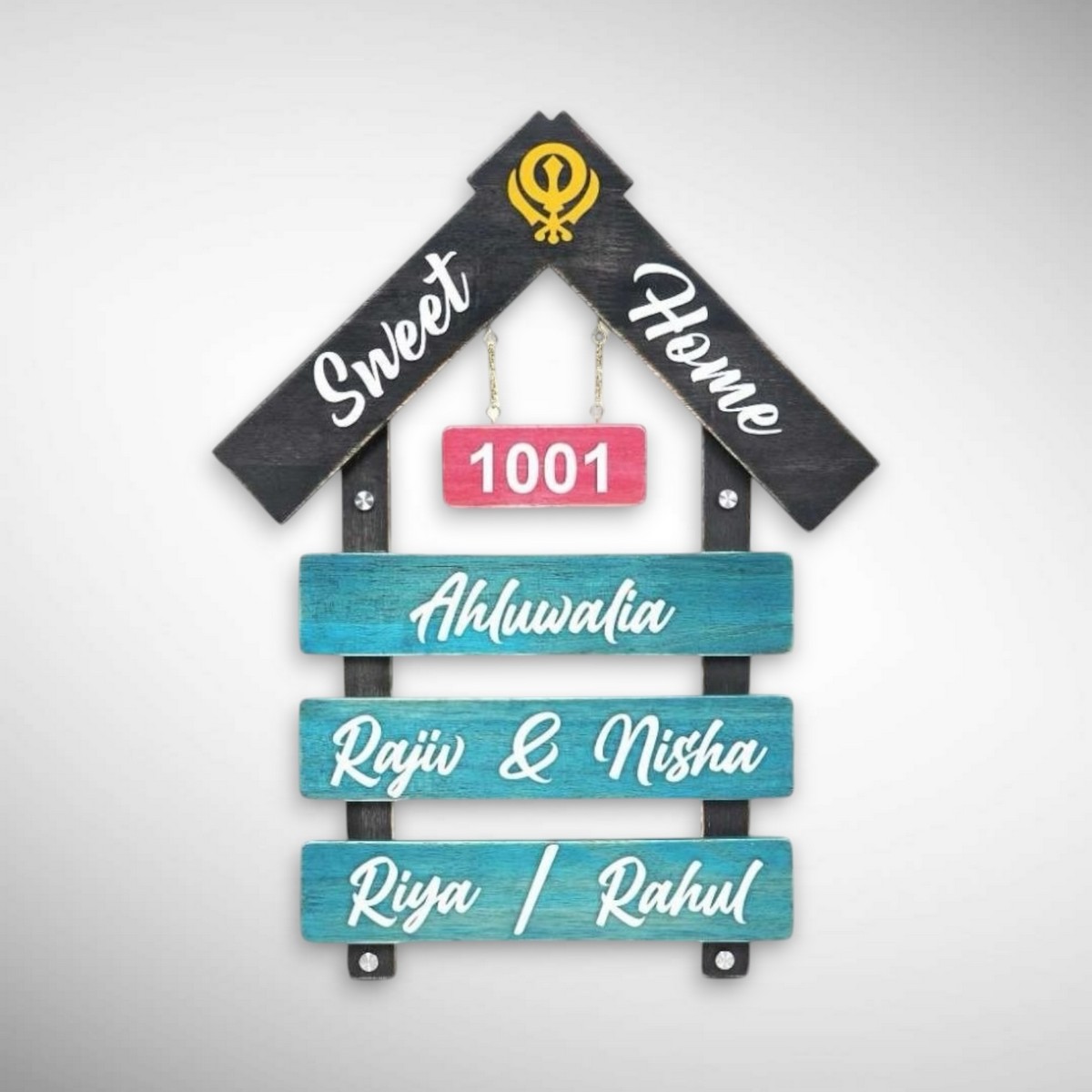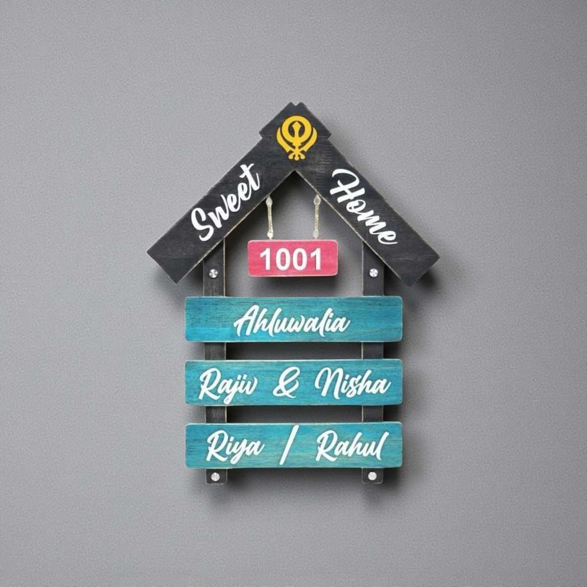 Made from premium wood, this nameplate reflects durability and sophistication. The layered design adds depth and character, perfectly highlighting your family name – Ahluwalia – with subtle elegance.