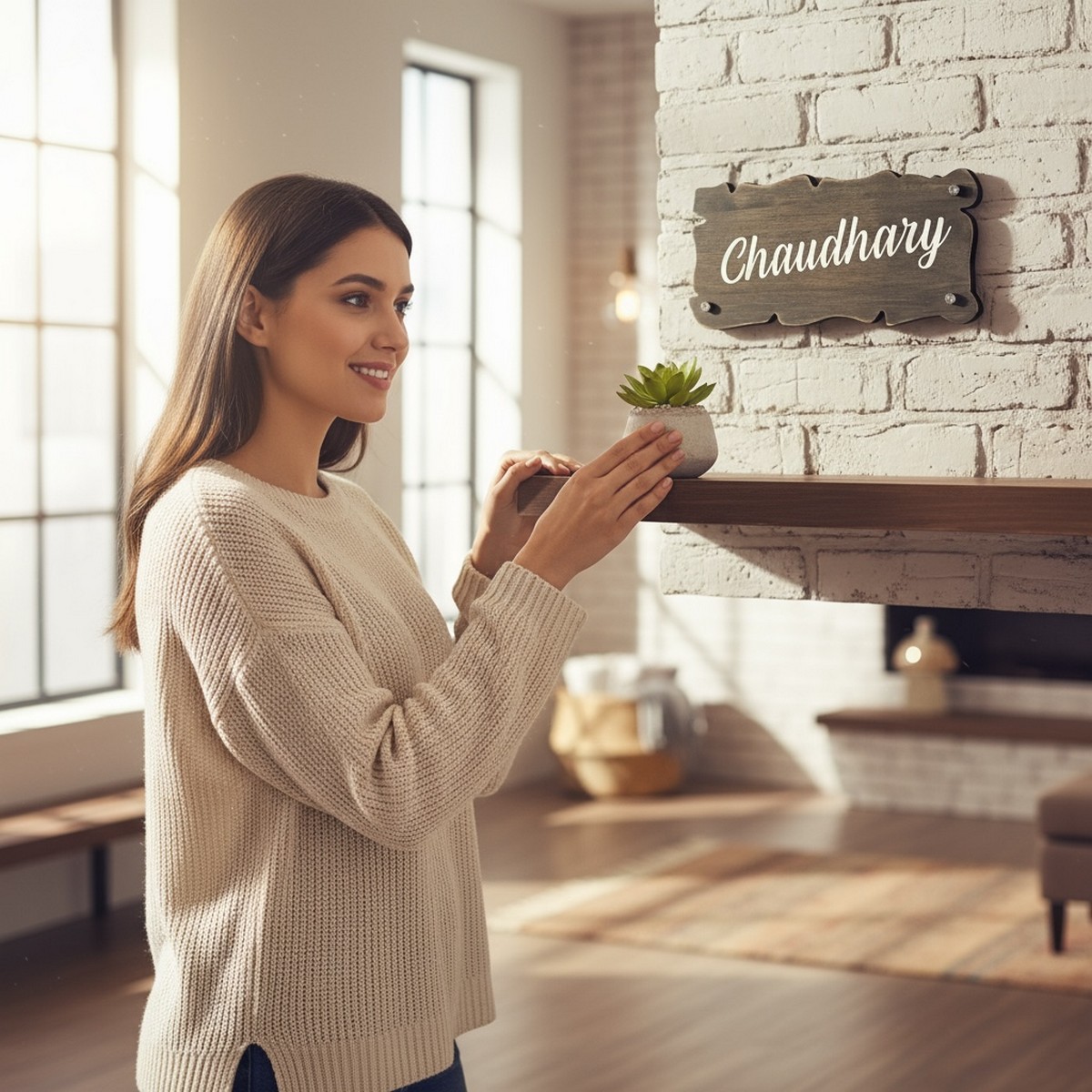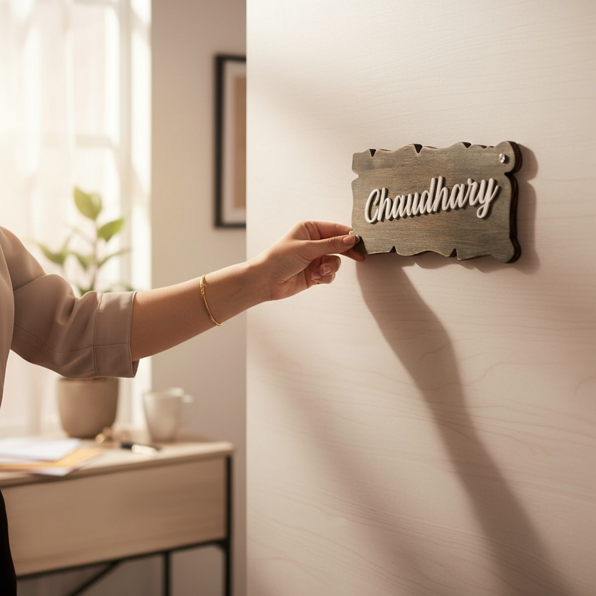 The Chaudhary Handcrafted Wooden Stylish Nameplate is designed to add warmth, personality, and sophistication to your home entrance.