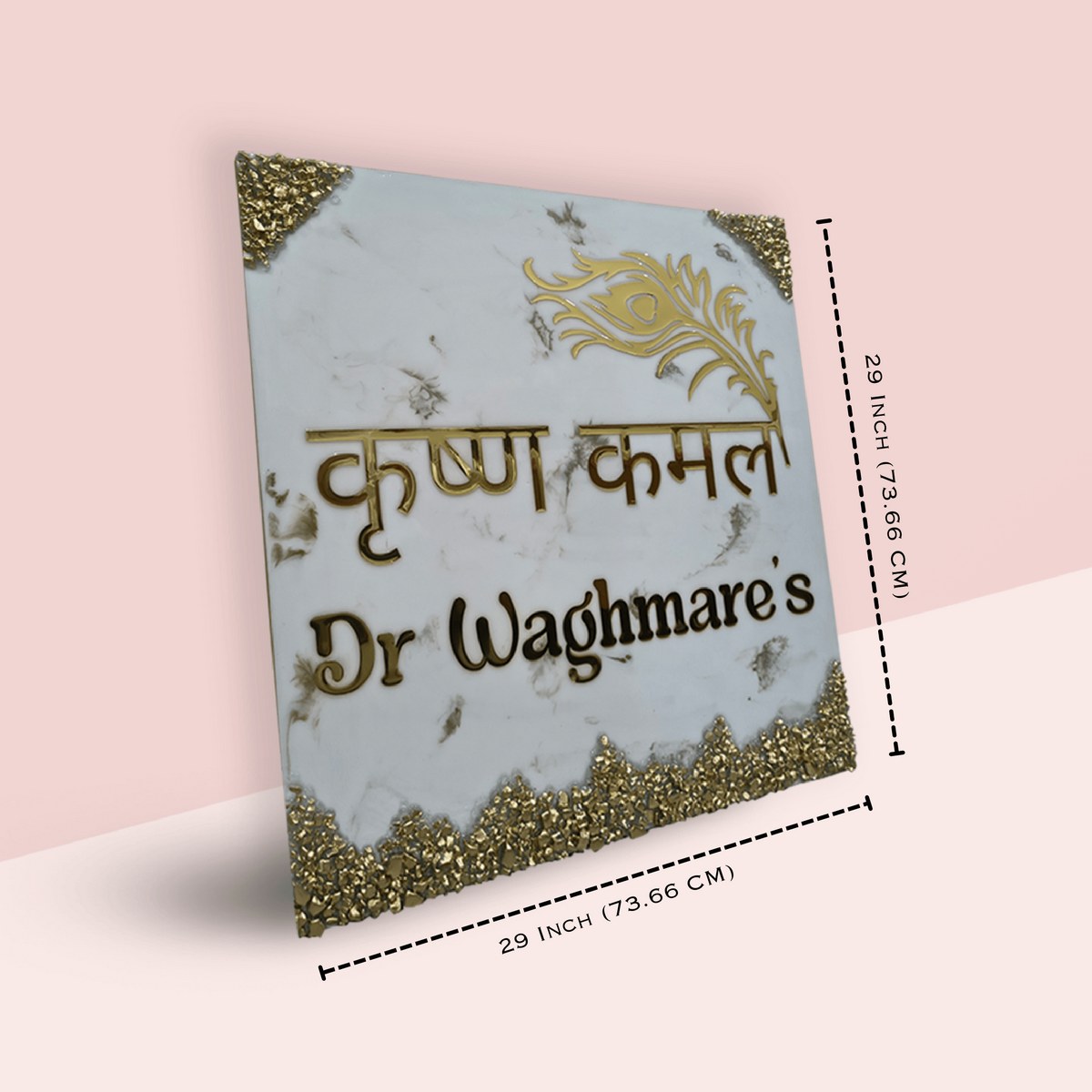 • Material Used: Laminated HDHMR used as base (12mm of thickness). Embossed with golden shiny acrylic letters, (1.5mm of thickness) crystals on each corner.
