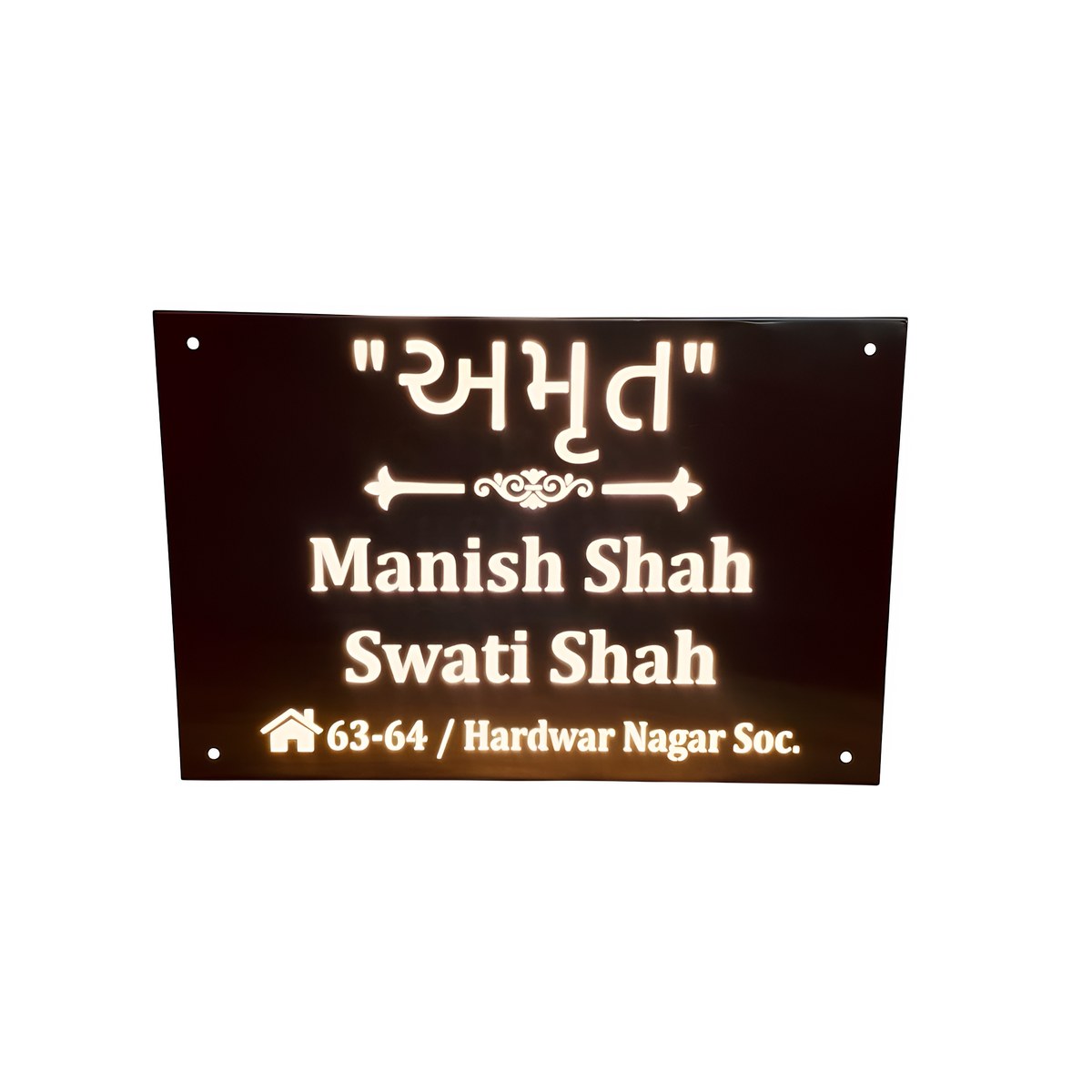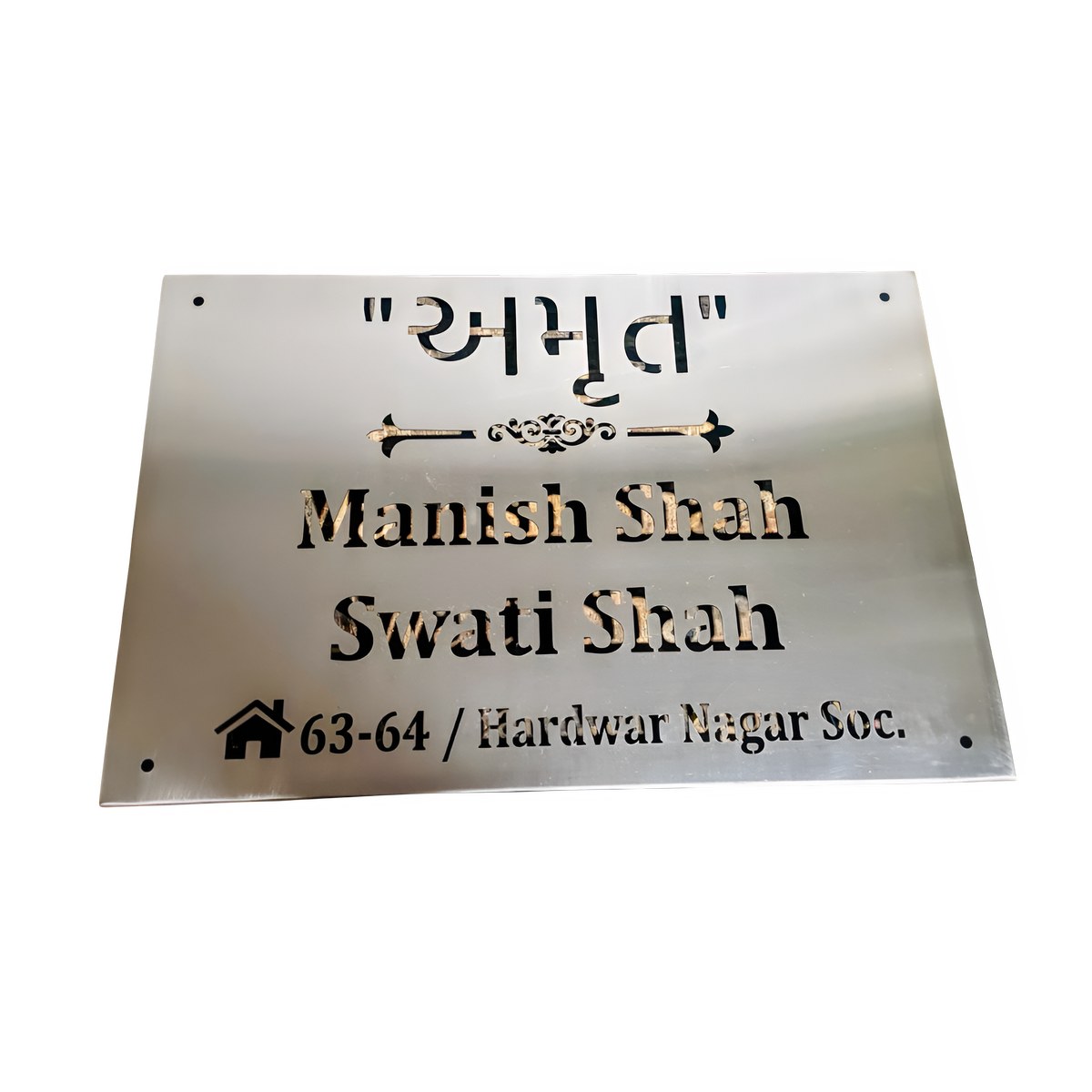Laser Cut Stainless Steel – This is a SS 304 LED Name Plate Plate along with Laser cutting. The plate comes with studs & screws making the installation process simple. The plate will be customized as per the customer’s requirements.
