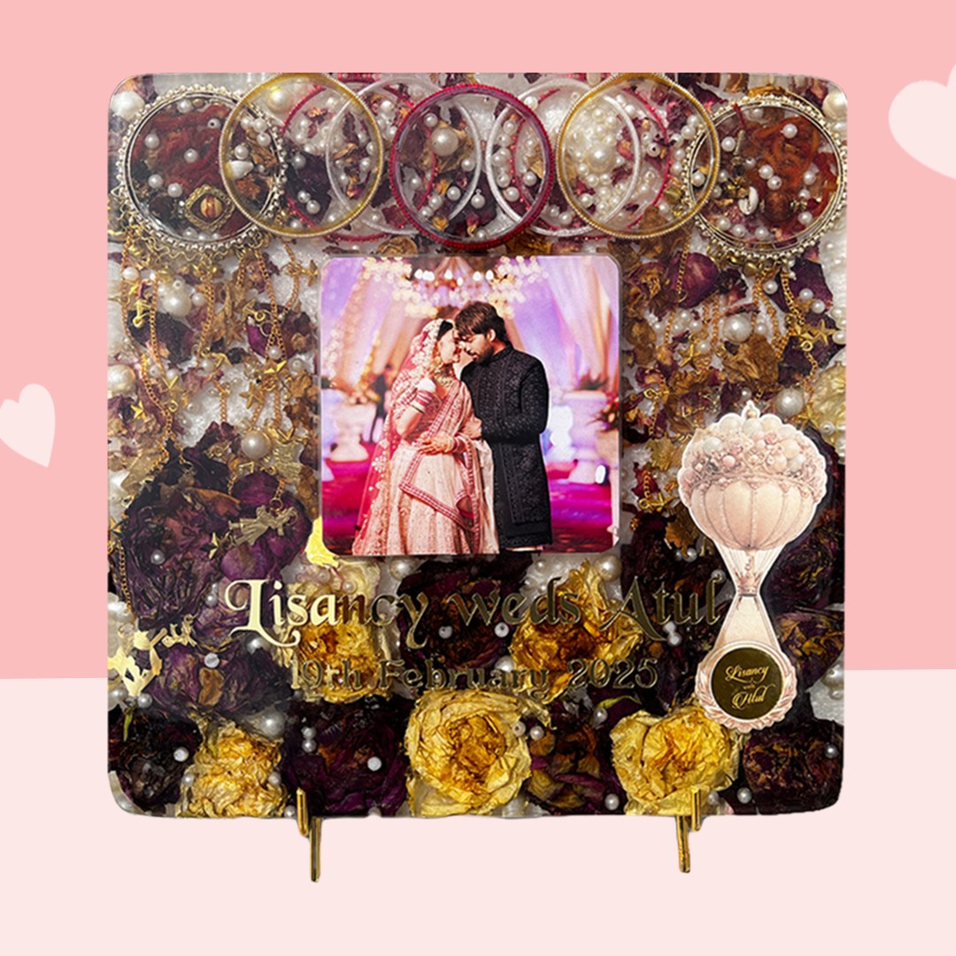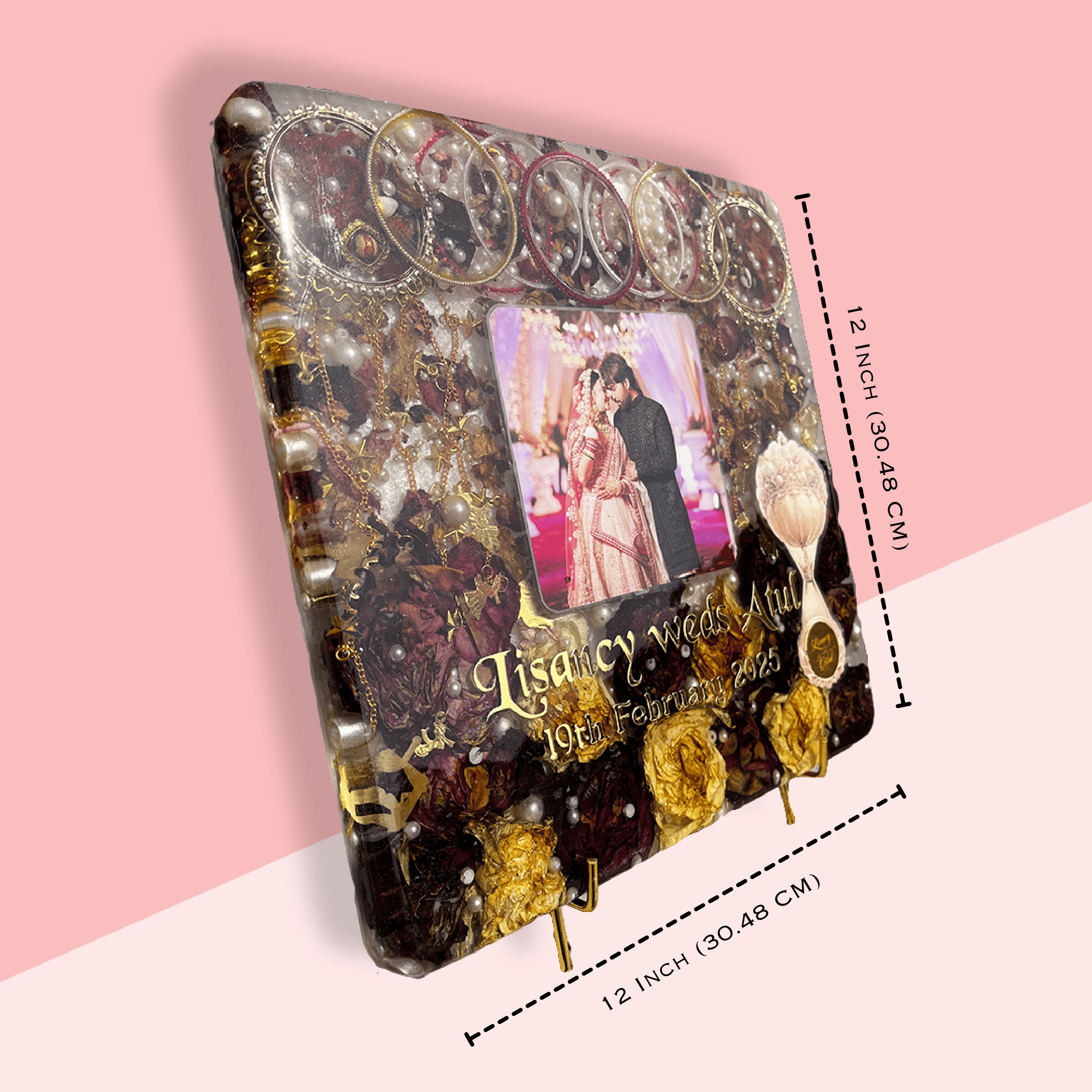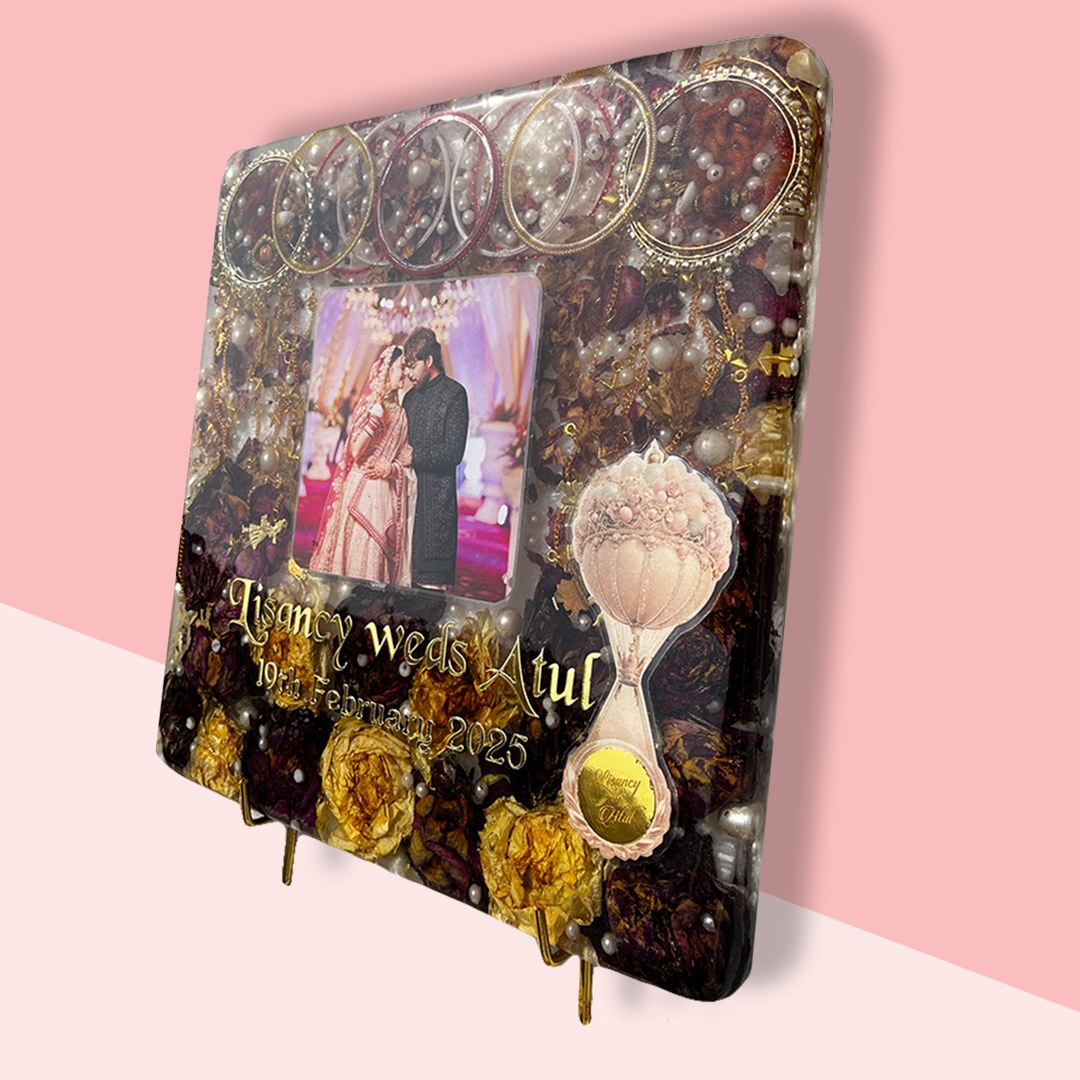 Beautiful dried rose flower and pearls of wedding garland preserve in resin with wedding card of beautiful couple decorated in a rectangle shape, their name and wedding date.