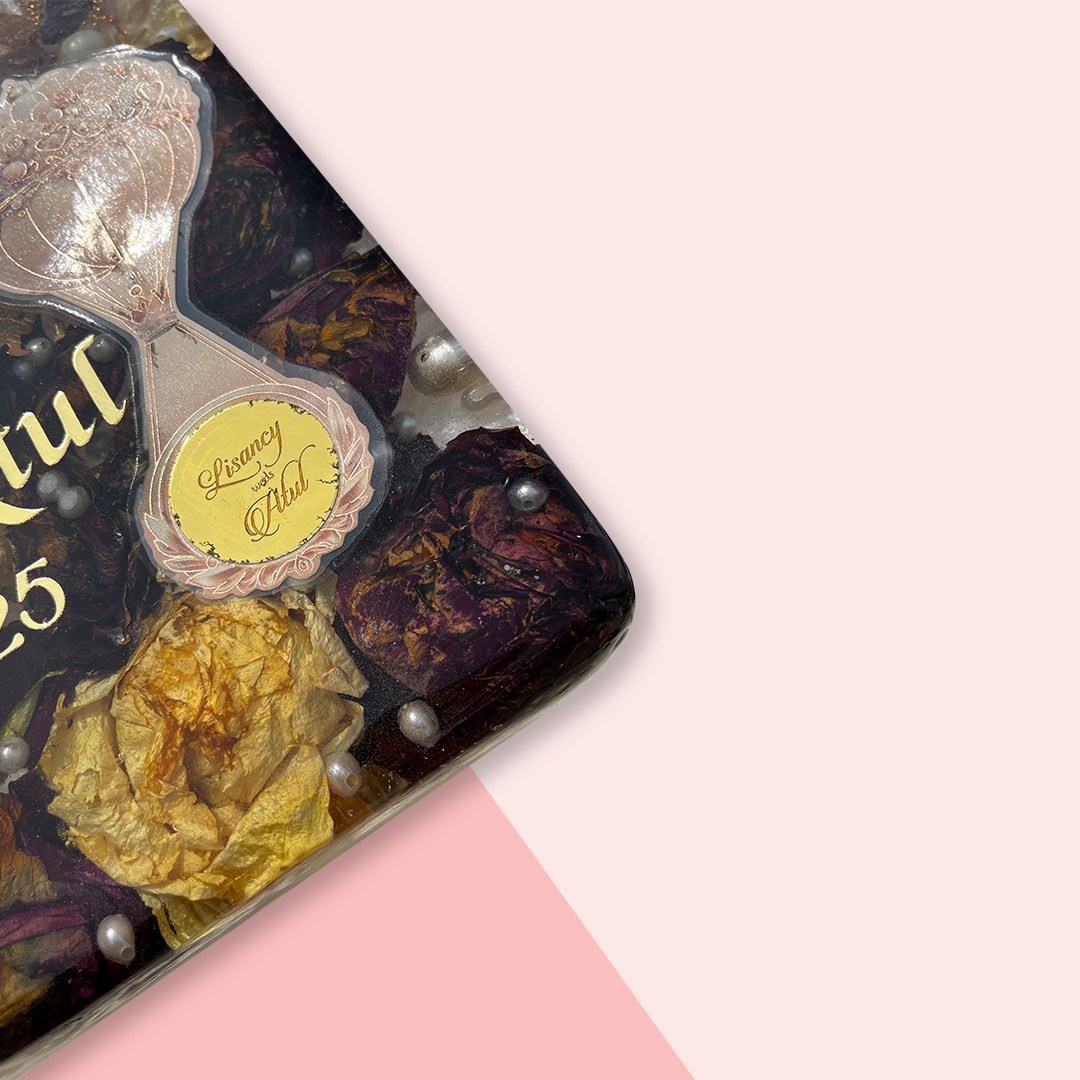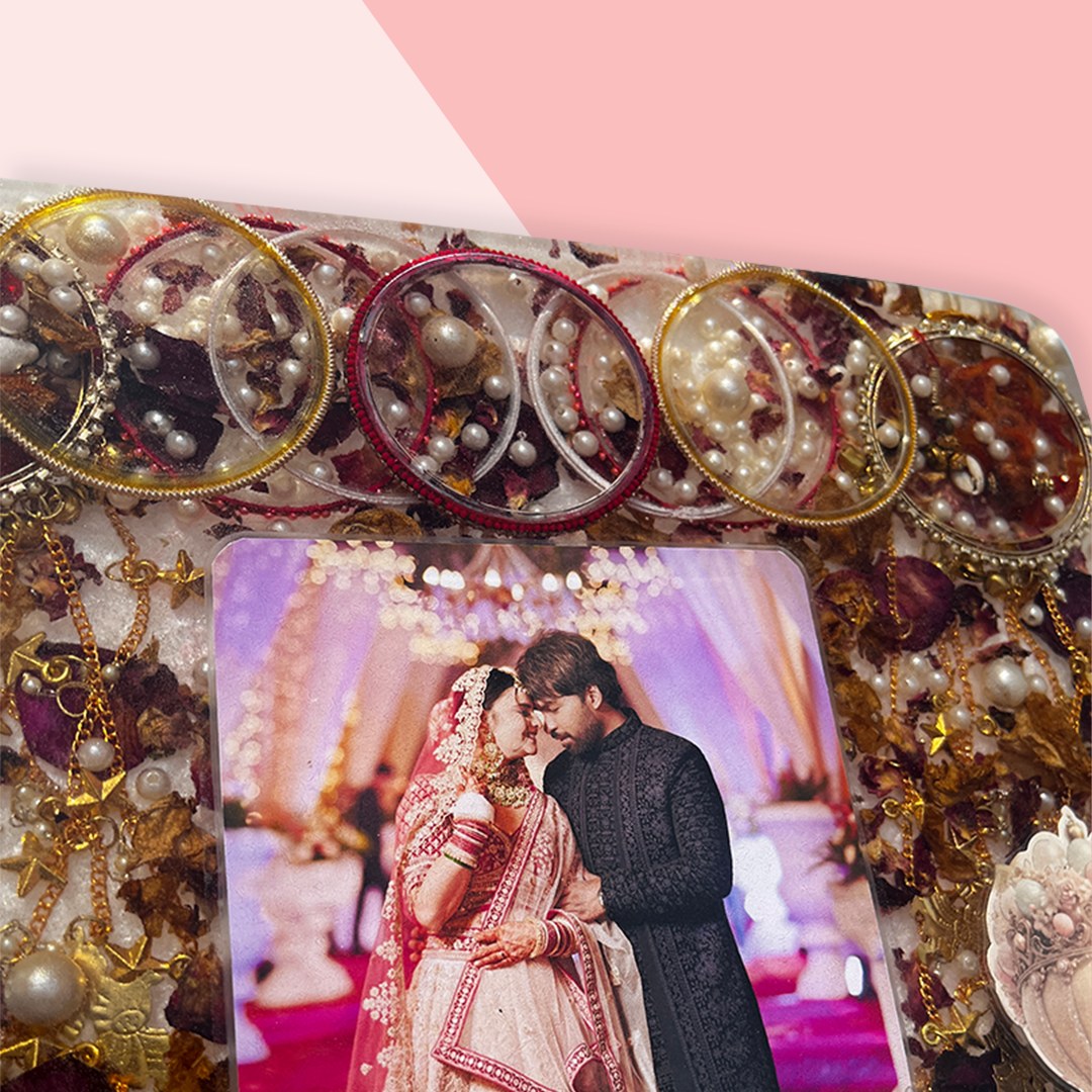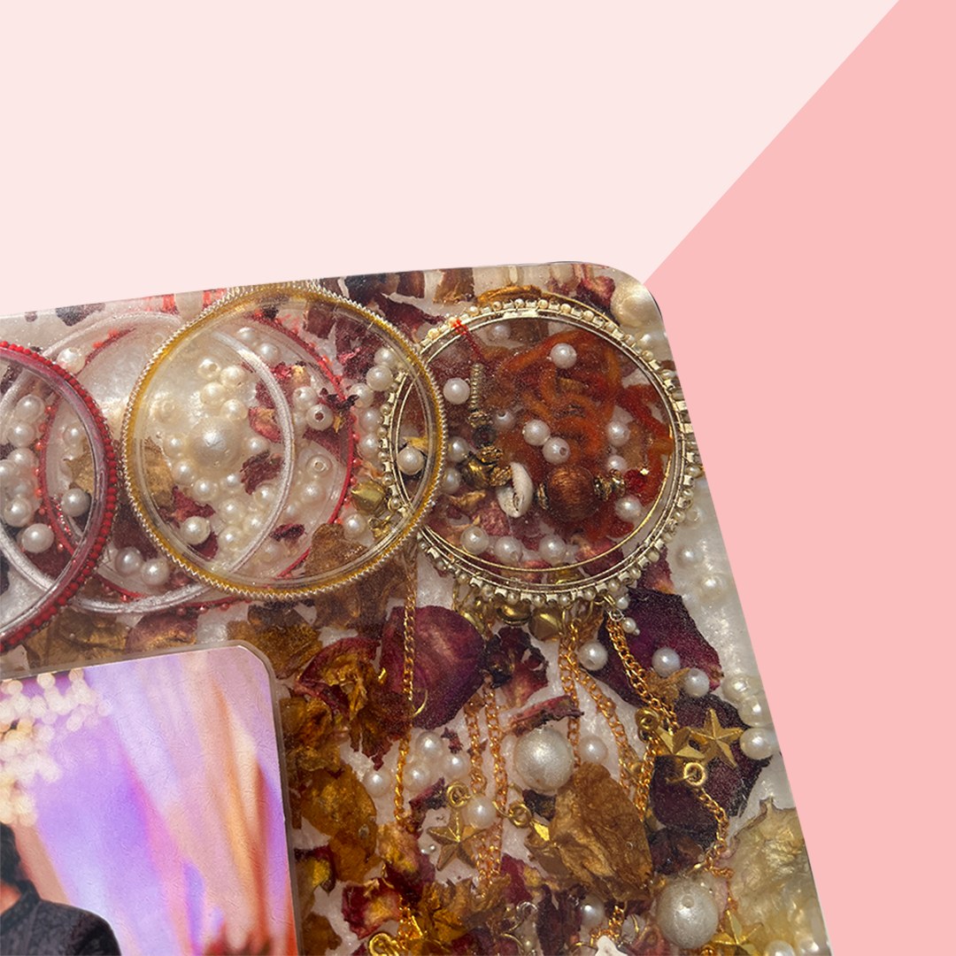 Beautiful dried rose flower and pearls of wedding garland preserve in resin with wedding card of beautiful couple decorated in a rectangle shape, their name and wedding date.