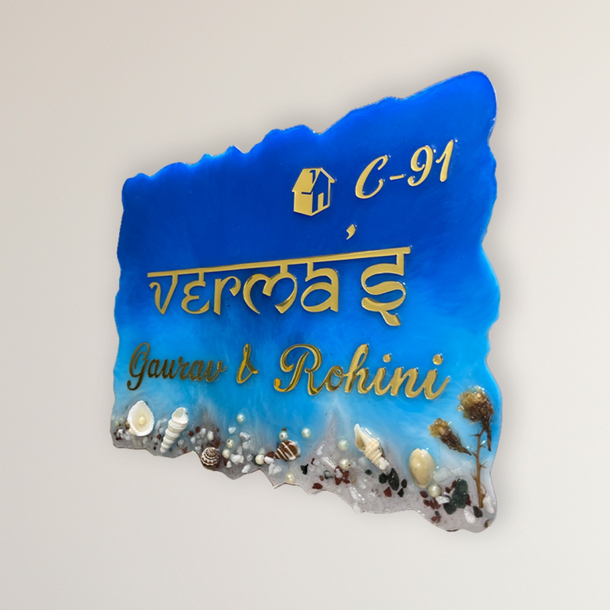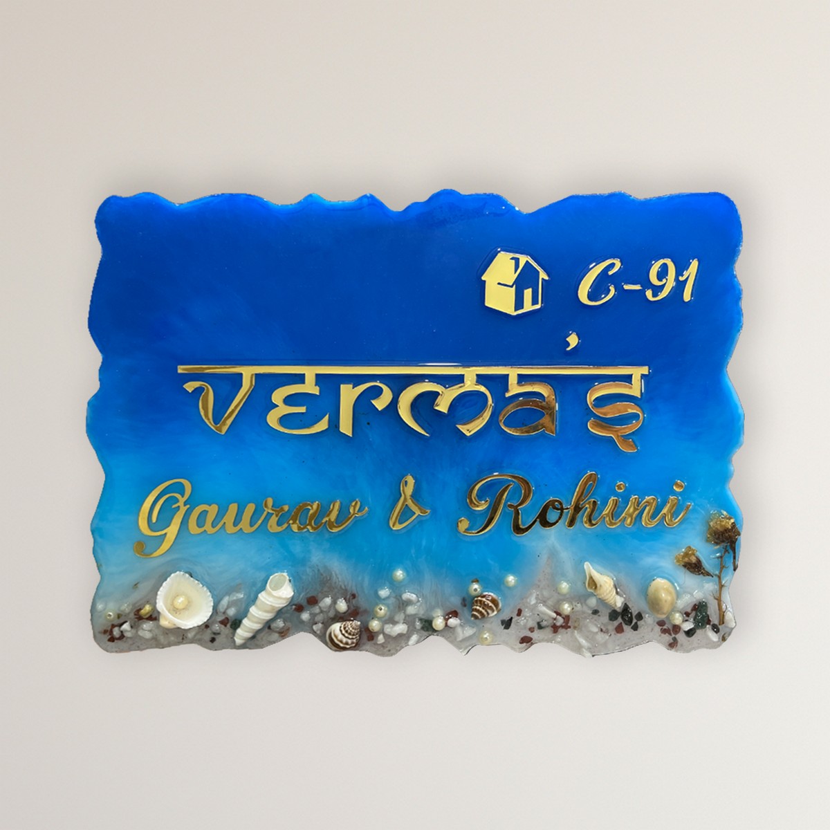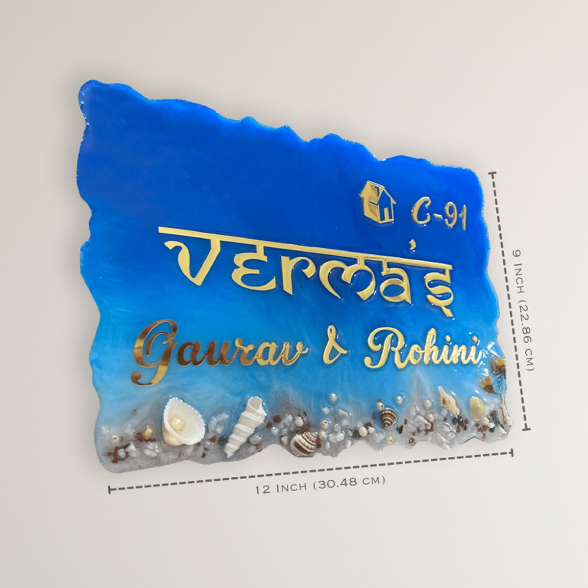 • Material Used: Resin Ocean base (10mm of thickness). Embossed with golden shiny acrylic letters, (1.5mm of thickness) and seashells with other elements.