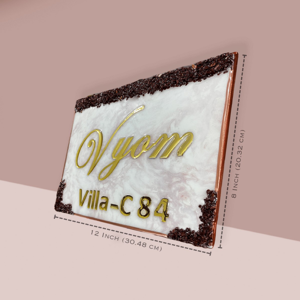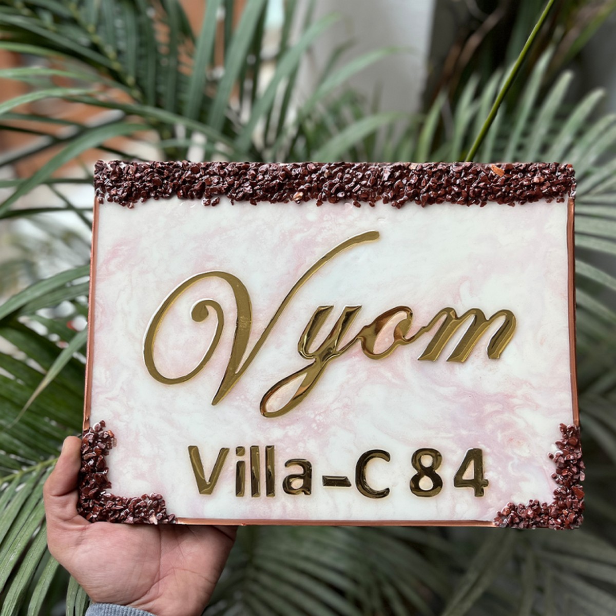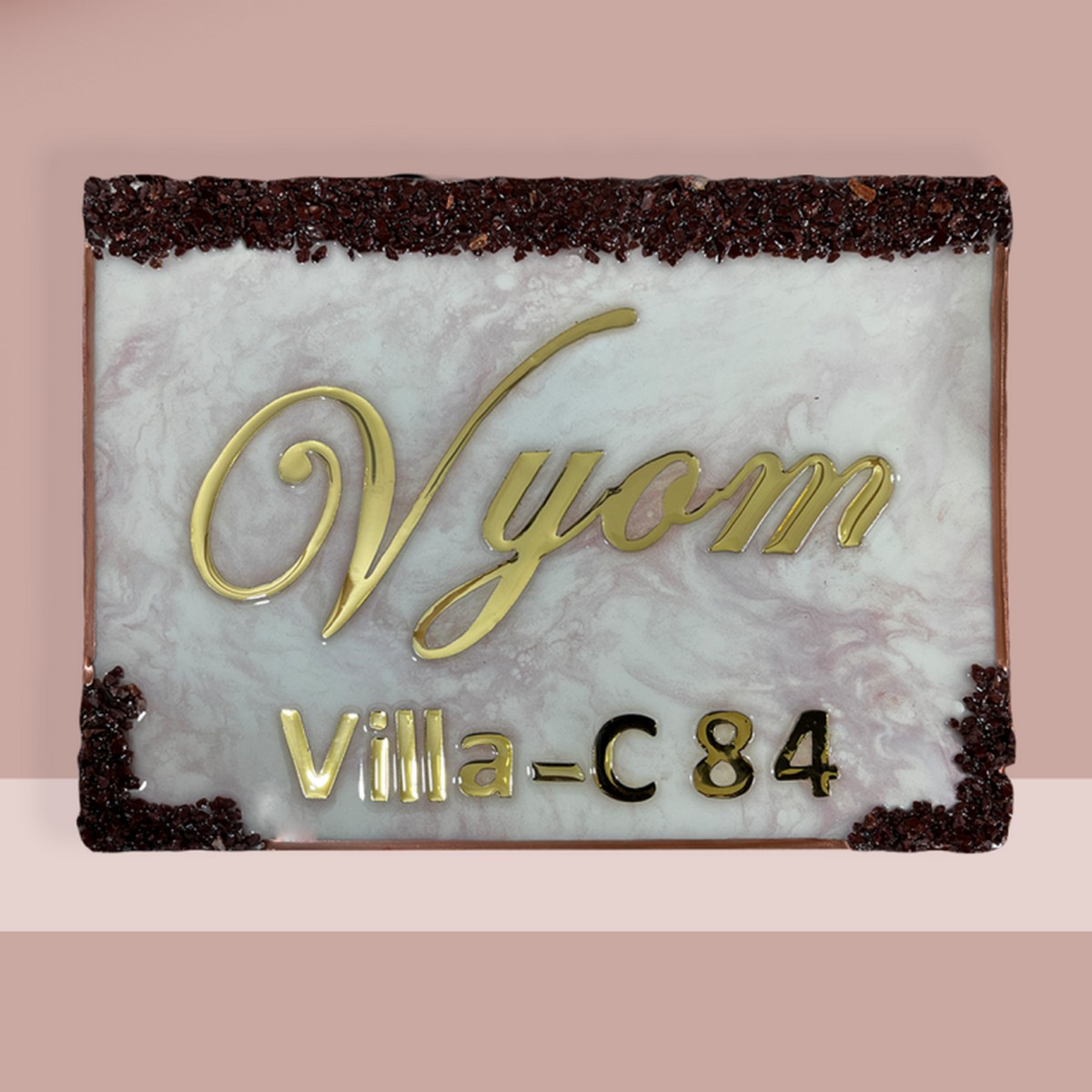 Pink Flare Vyom Resin House Nameplate ✨ Elevate your space with the stunning Pink and White Base Resin Nameplate, Beautifully enhanced with golden highlights and a durable resin coating! 🌟 Perfect for adding a touch of elegance to your home or office, this nameplate not only showcases your name but also reflects your unique style. 🏡💼 Customize yours today and make a lasting impression! 💖 This handmade name plate is made up of premium epoxy resin material, with glossy finish, Available in many languages. Premium quality nameplate for your home/flat/bungalow. Suitable for installation in sun, rain and termite exposed areas.