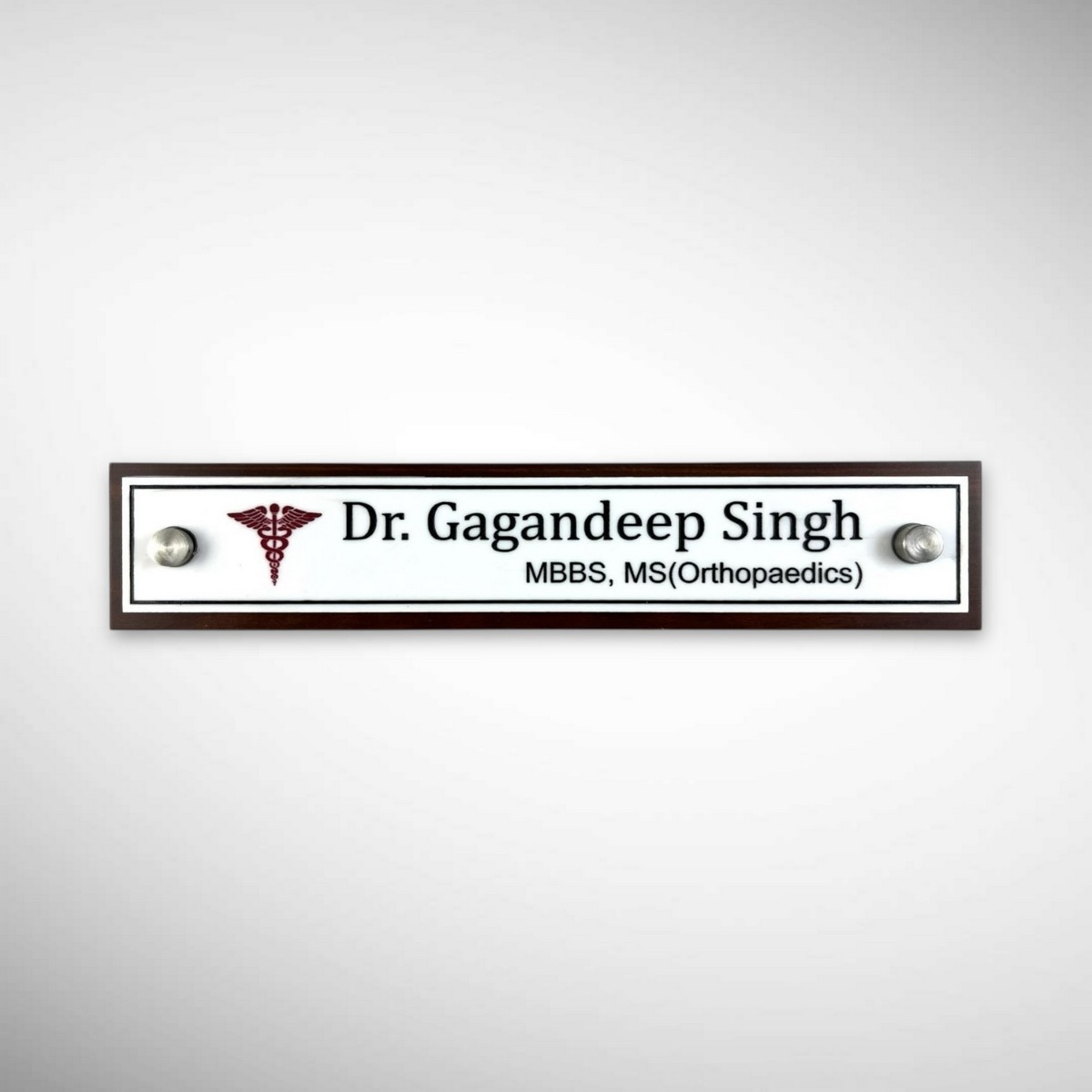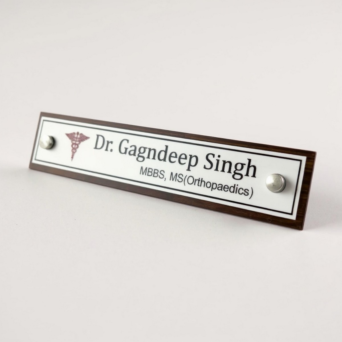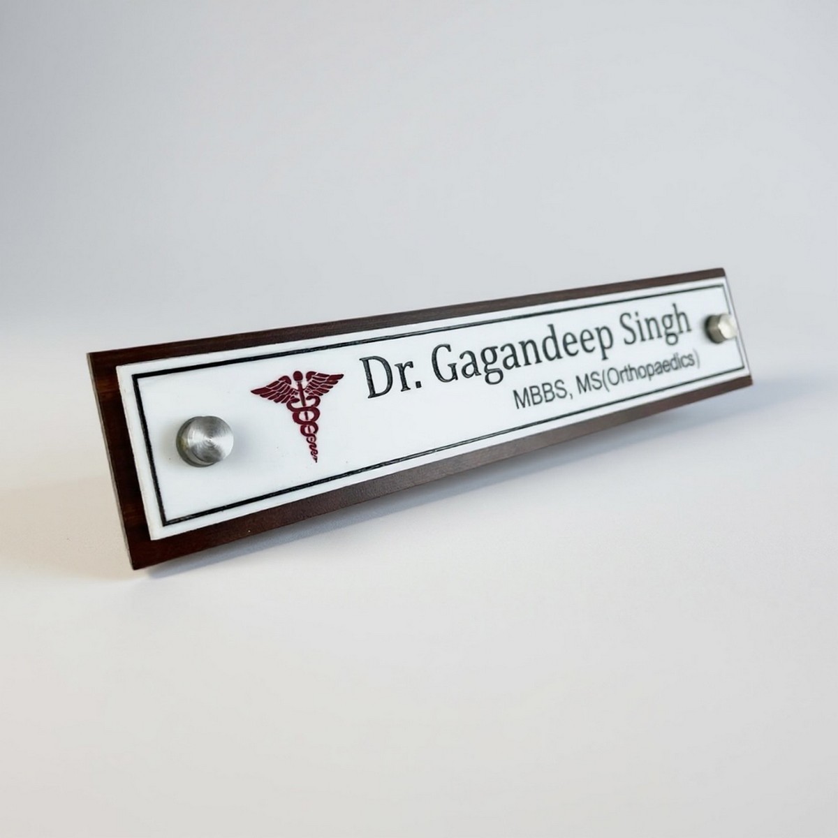 This professional desk nameplate for doctors features a sturdy wooden base and clean acrylic lettering for a modern, polished look. Designed for clinics, hospitals, and office desks, it displays the name Dr. Gagandeep Singh clearly and stylishly.