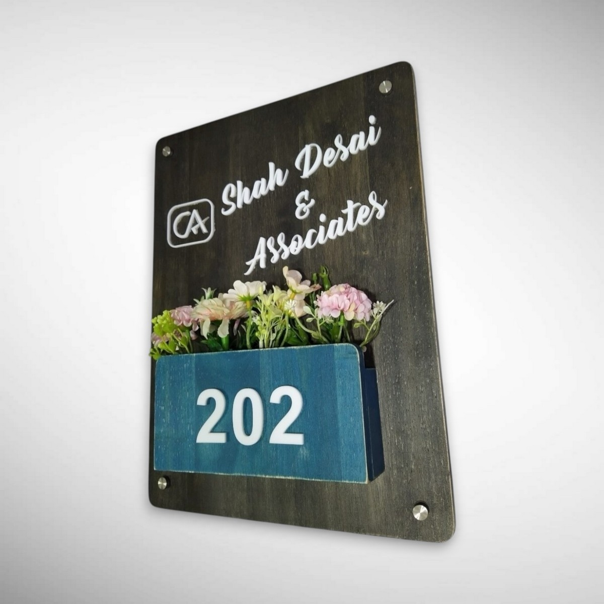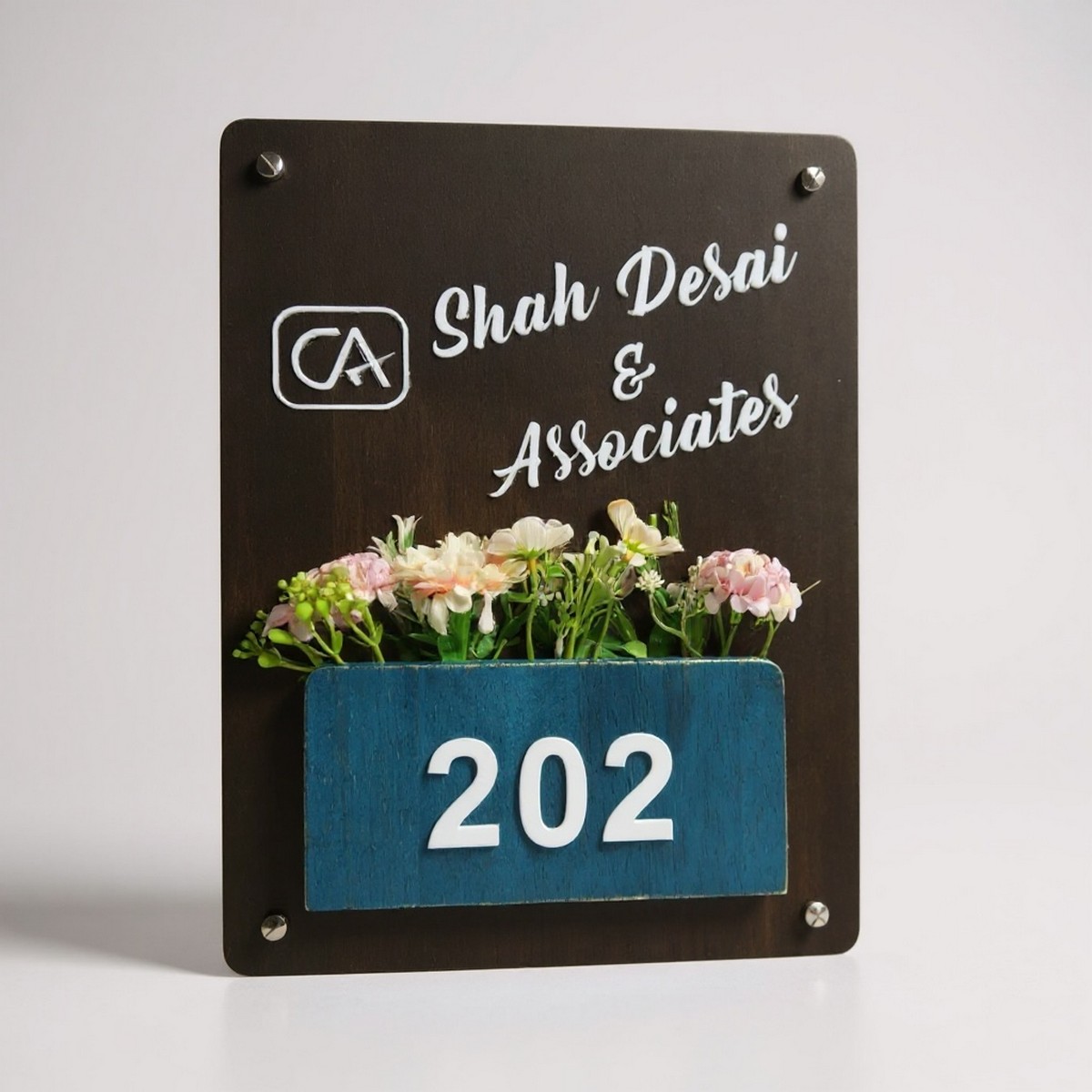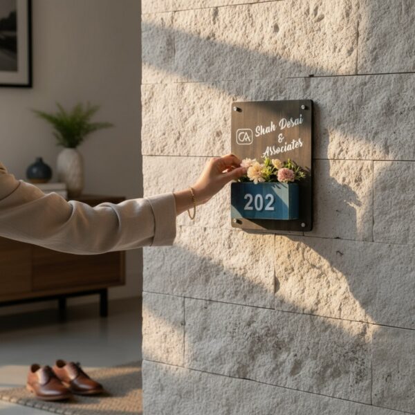 Bring warmth, nature, and elegance to your home entrance with our Rubber Wood Brown Polish Planter Nameplate – Shah Desai. Handcrafted from premium rubber wood and finished with a rich brown polish, this nameplate features a charming planter design that adds a refreshing, earthy touch to your space.
