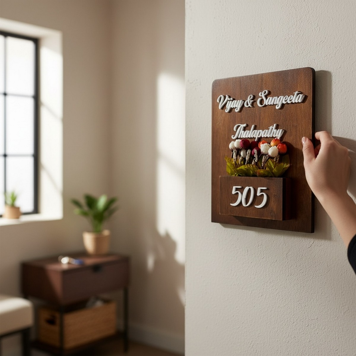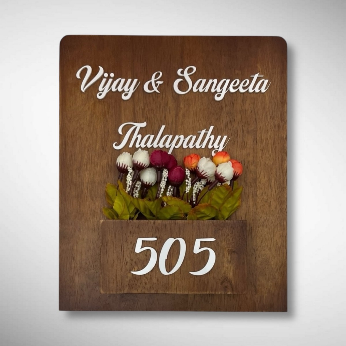 Upgrade your home entrance with our Rubber Wood Brown Polish Planter Nameplate featuring Thalapathy design. Made from durable rubber wood and coated with a premium brown finish, this nameplate offers both style and strength.