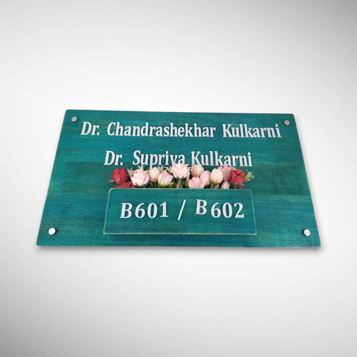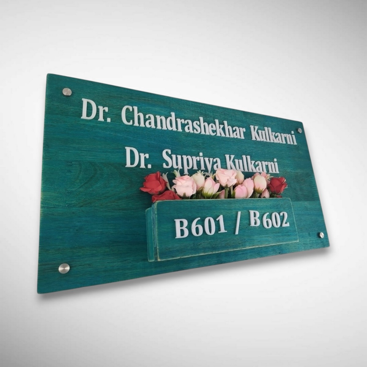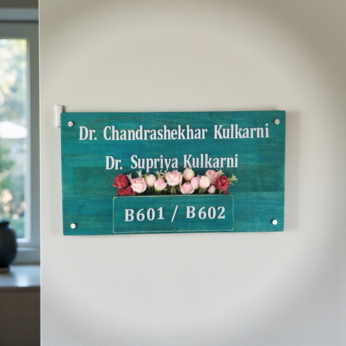Designed for the Kulkarni Family, this nameplate blends solid rubber wood, delicate floral elements, and a natural planter-style design to create a warm, welcoming entrance for your home.
