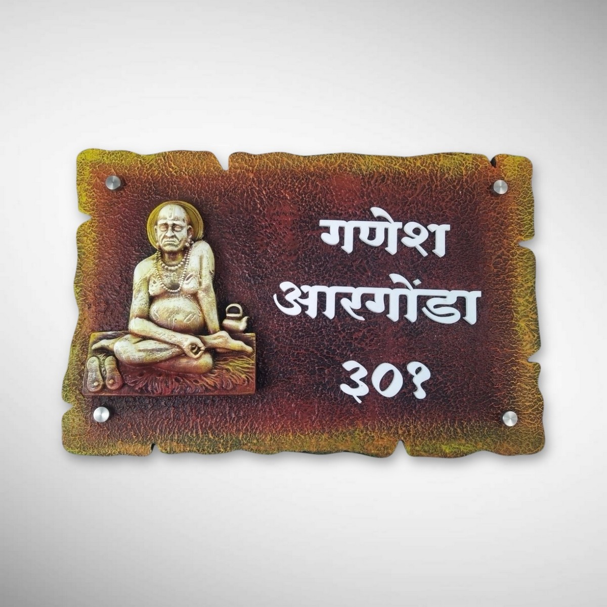Made using a sturdy wooden base and a stone-finish texture, this nameplate features a finely crafted Swami Samarth idol that brings divine blessings to your space.