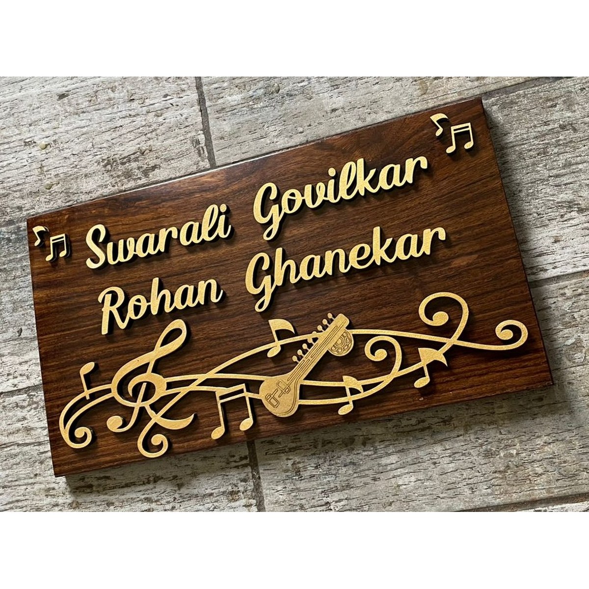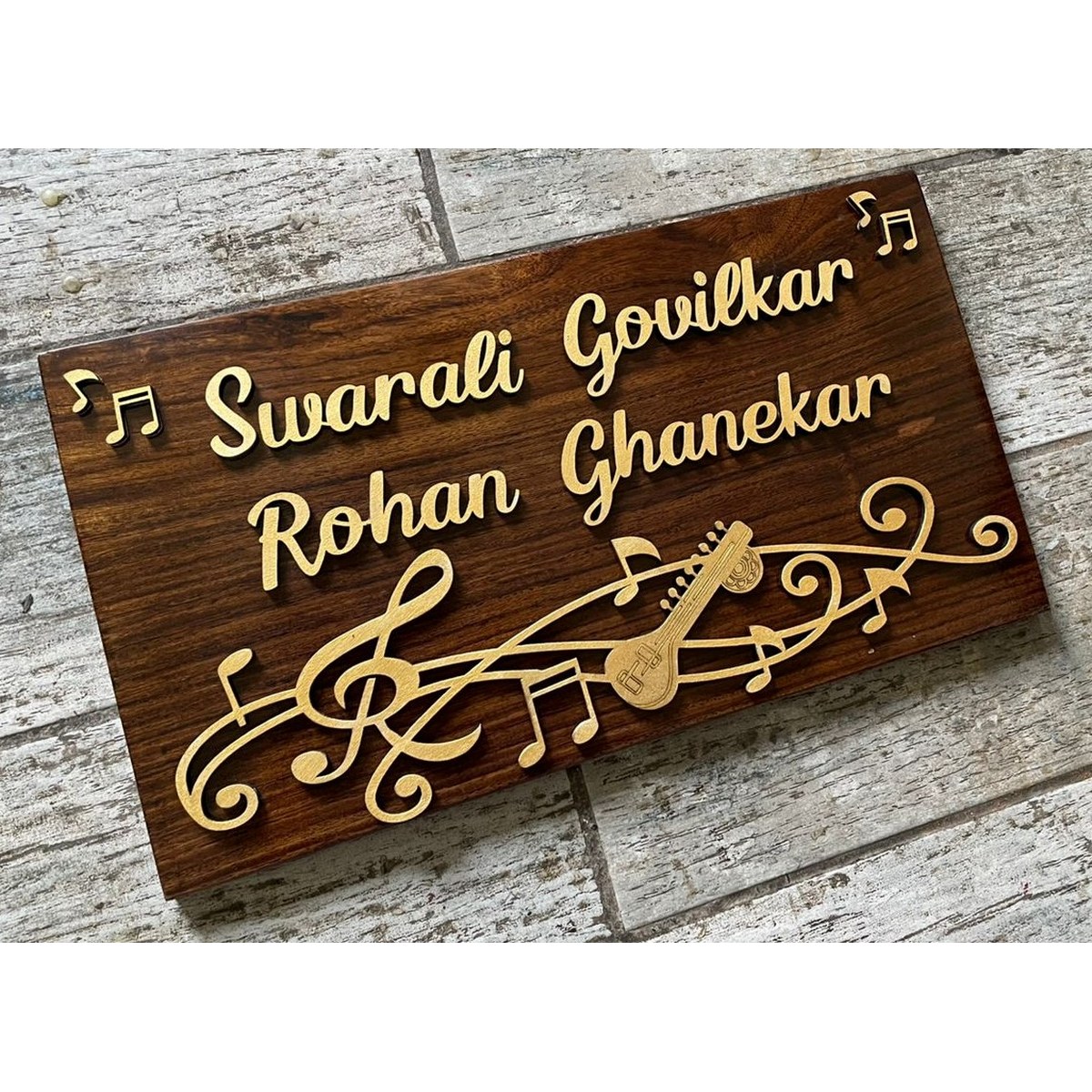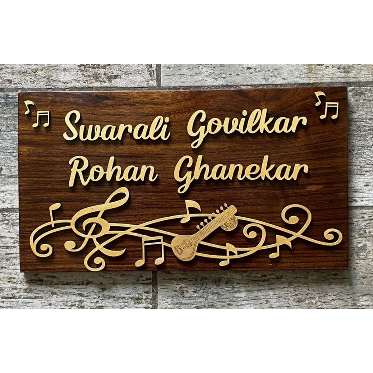 Sheesham Wood House Nameplate- We have designed this nameplate for music lovers. The waves showed on the nameplate depict the journey of music to the soul. We have designed the name, initials as musical Logo.