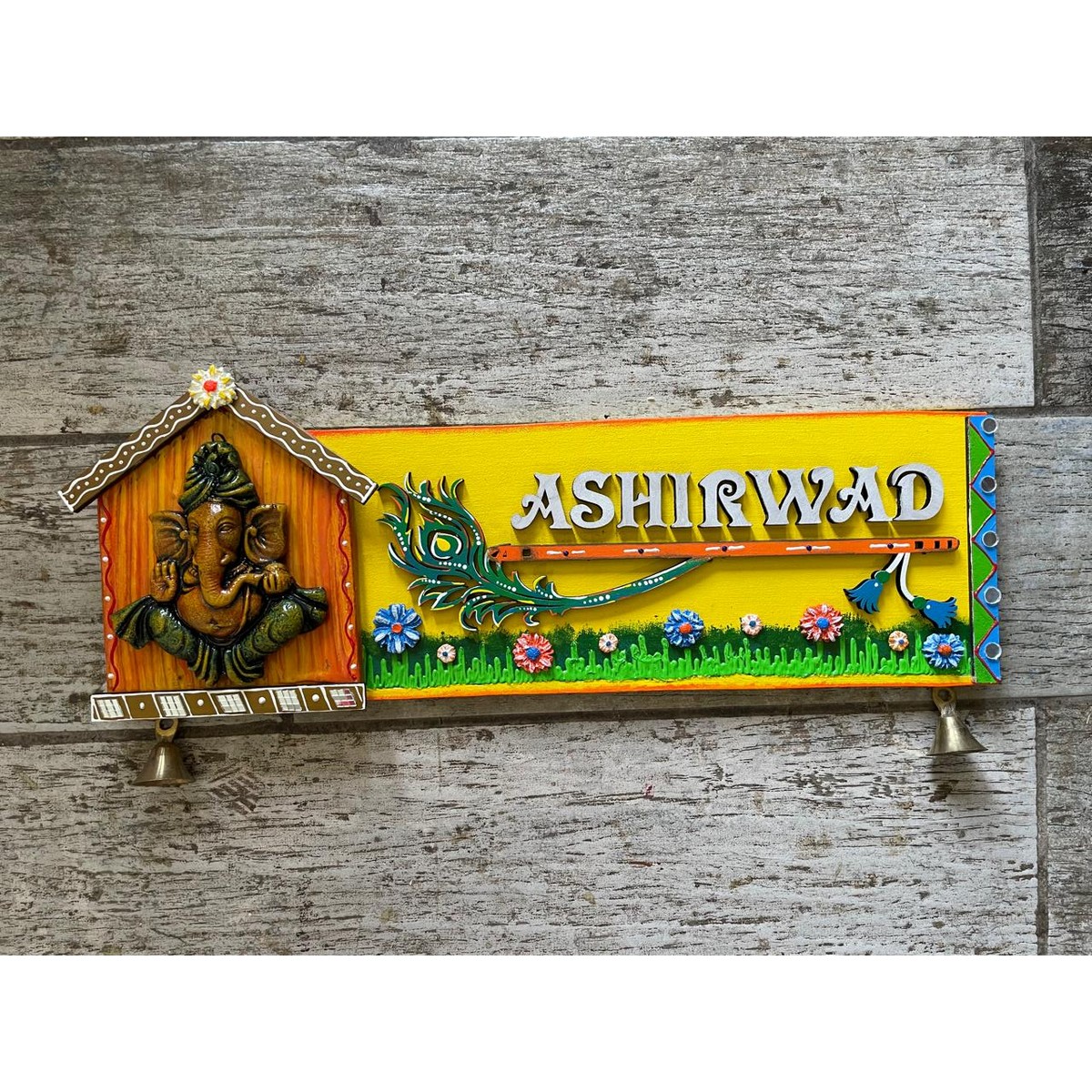 Infuse your space with divine blessings and vibrant colors with our Ganesha Nameplate featuring a 3-D Ganesha figure, hand-painted flute, feather, and colorful floral accents.