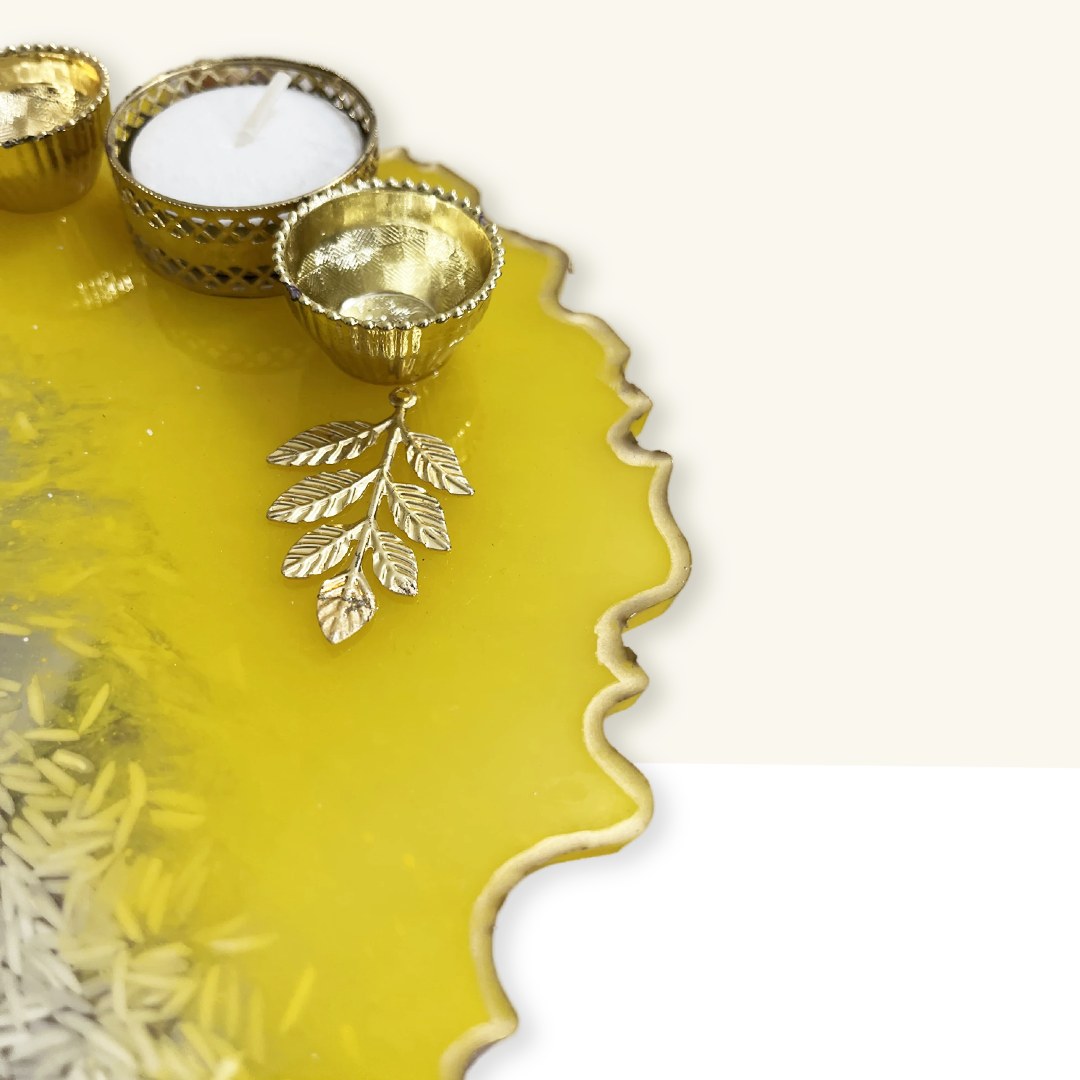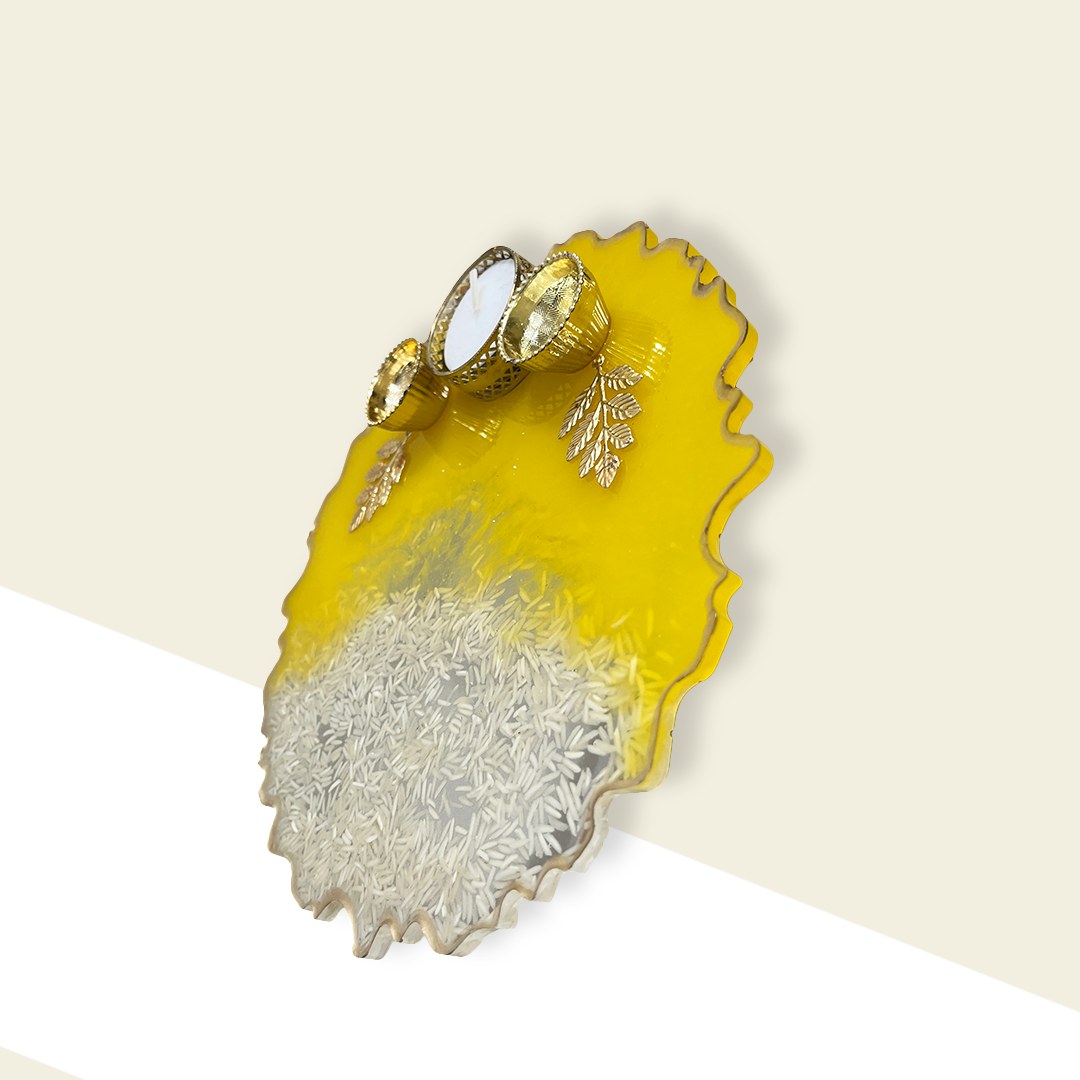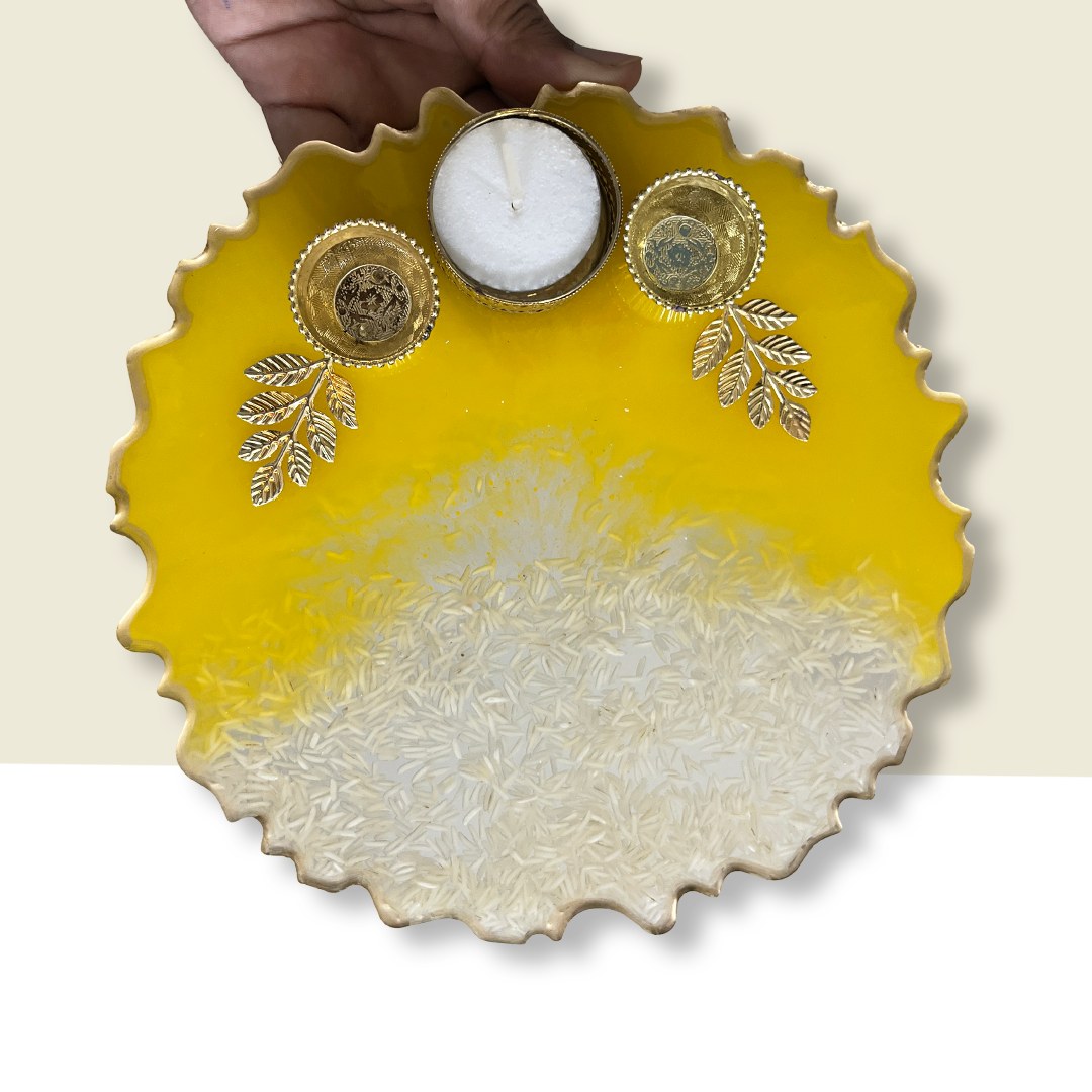Resin Pooja Thali – Celebrate tradition with a burst of sunshine! The Yellow Theme Festive Resin Pooja Thali is a radiant blend of devotional charm and contemporary elegance, designed to elevate your spiritual rituals with warmth and grace.