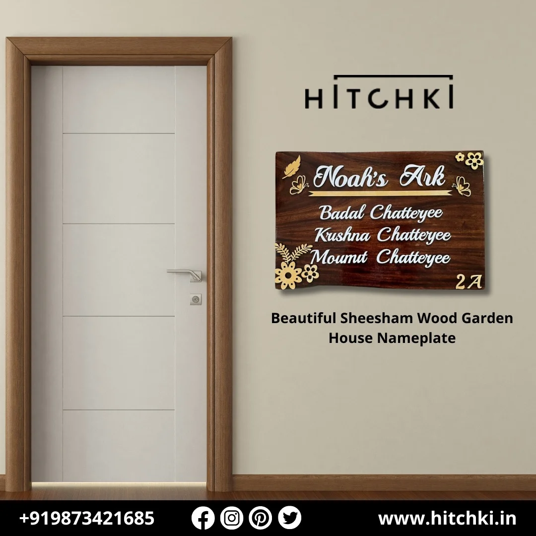 Enhance your home’s entrance with Hitchki’s handcrafted Sheesham Wood Garden House Nameplate. Made from premium Sheesham wood and adorned with elegant floral elements, this nameplate brings a charming, personalized touch to your home’s identity.